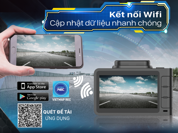 – Camera hành trình Vietmap R4A sử dụng kết nối WIFI không dây. Giúp người dùng có thể dễ dàng xem lại, lưu trữ và chia sẻ video hành trình về điện thoại di động hay các trang mạng xã hội khác. Đồng thời còn tiện cho việc cập nhật dữ liệu cảnh báo biển báo giao thông trực tiếp trên ứng dụng VIETMAP REC.