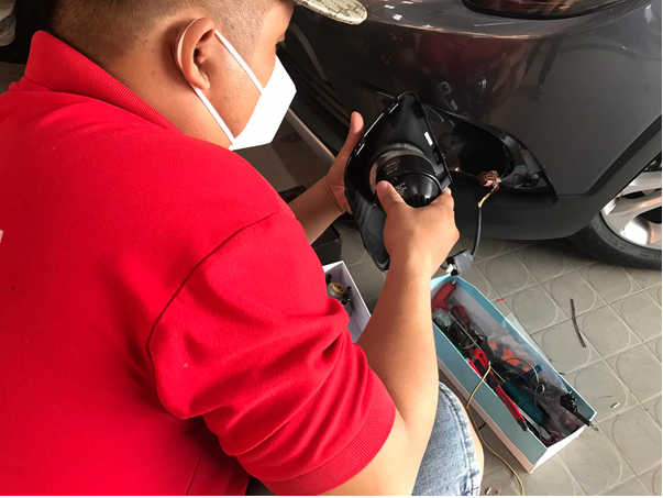 – Sau khi bung đèn, kỹ thuật đưa bi gắn vào chóa đèn và kết nối nguồn điện trên hệ thống đèn xe với các loại giây giật, cầu chì, Rơ le để đảm bảo hệ thống điện chạy được đảm bảo, không chập cháy, mất đồng bộ khi chuyển pha, cos