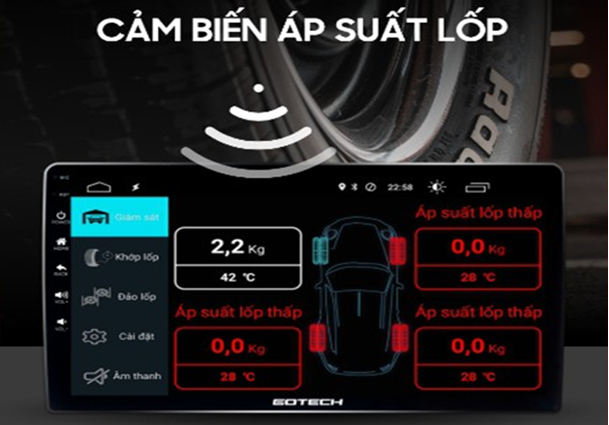 – Trong trường hợp lốp gặp sự cố, cảm biến áp suất lốp sẽ đưa ra cảnh báo bằng hình ảnh qua màn hình ô tô thông minh Gotech GT8 Max hoặc âm thanh qua hệ thống loa. Như vậy, người lái xe dễ dàng phát hiện điều bất thường, lái xe an toàn hơn.