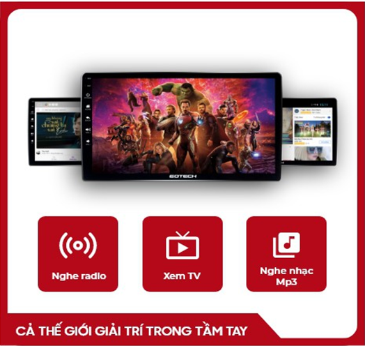 – Màn hình Gotech GT10 Pro biến chiếc xe trở thành ngôi nhà thứ 2 của bạn với rất nhiều ứng dụng giải trí đa phương tiện như: Youtube, VTV Go, Zing MP3...